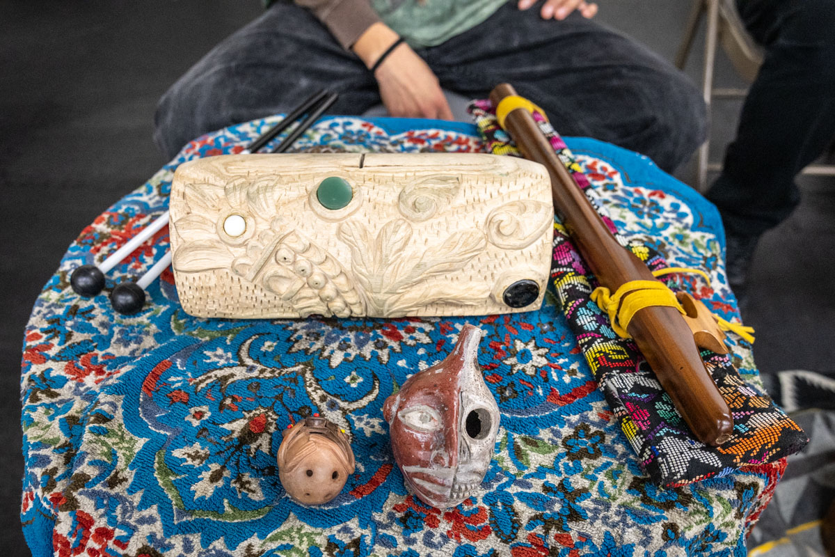 Yaotl Orozco and Zacarias Bernal are the teaching artists for Tia Chucha’s Cultural Music class. Yaotl is also part of the band of Aztlan Unearthed. The teaching artists were joined by Aztlan Unearthed members, Frank Aragon, Joe Galarza and Ignacio Lopez. This mini concert brought together the band and participants of the class to celebrate through music their accomplishments throughout the class. The class met weekly to share indigenous rhythms, and shared together their healing experiences. Throughout the class they had cultural exchanges, and shared memories and teachings from their home communities.
