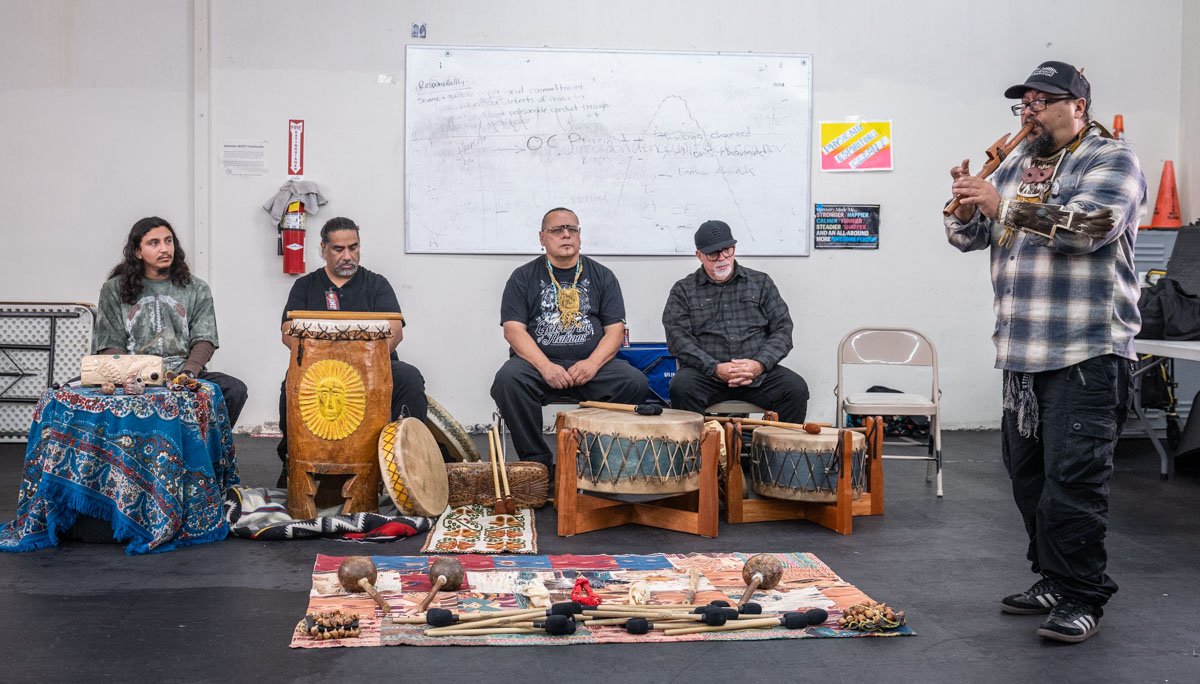 Yaotl Orozco and Zacarias Bernal are the teaching artists for Tia Chucha’s Cultural Music class. Yaotl is also part of the band of Aztlan Unearthed. The teaching artists were joined by Aztlan Unearthed members, Frank Aragon, Joe Galarza and Ignacio Lopez. This mini concert brought together the band and participants of the class to celebrate through music their accomplishments throughout the class. The class met weekly to share indigenous rhythms, and shared together their healing experiences. Throughout the class they had cultural exchanges, and shared memories and teachings from their home communities.