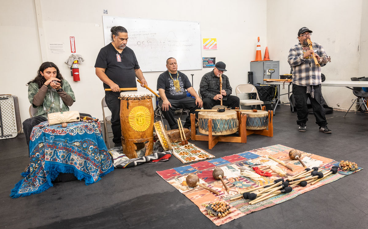Yaotl Orozco and Zacarias Bernal are the teaching artists for Tia Chucha’s Cultural Music class. Yaotl is also part of the band of Aztlan Unearthed. The teaching artists were joined by Aztlan Unearthed members, Frank Aragon, Joe Galarza and Ignacio Lopez. This mini concert brought together the band and participants of the class to celebrate through music their accomplishments throughout the class. The class met weekly to share indigenous rhythms, and shared together their healing experiences. Throughout the class they had cultural exchanges, and shared memories and teachings from their home communities.