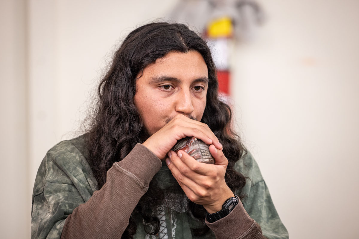 Yaotl Orozco and Zacarias Bernal are the teaching artists for Tia Chucha’s Cultural Music class. Yaotl is also part of the band of Aztlan Unearthed. The teaching artists were joined by Aztlan Unearthed members, Frank Aragon, Joe Galarza and Ignacio Lopez. This mini concert brought together the band and participants of the class to celebrate through music their accomplishments throughout the class. The class met weekly to share indigenous rhythms, and shared together their healing experiences. Throughout the class they had cultural exchanges, and shared memories and teachings from their home communities.