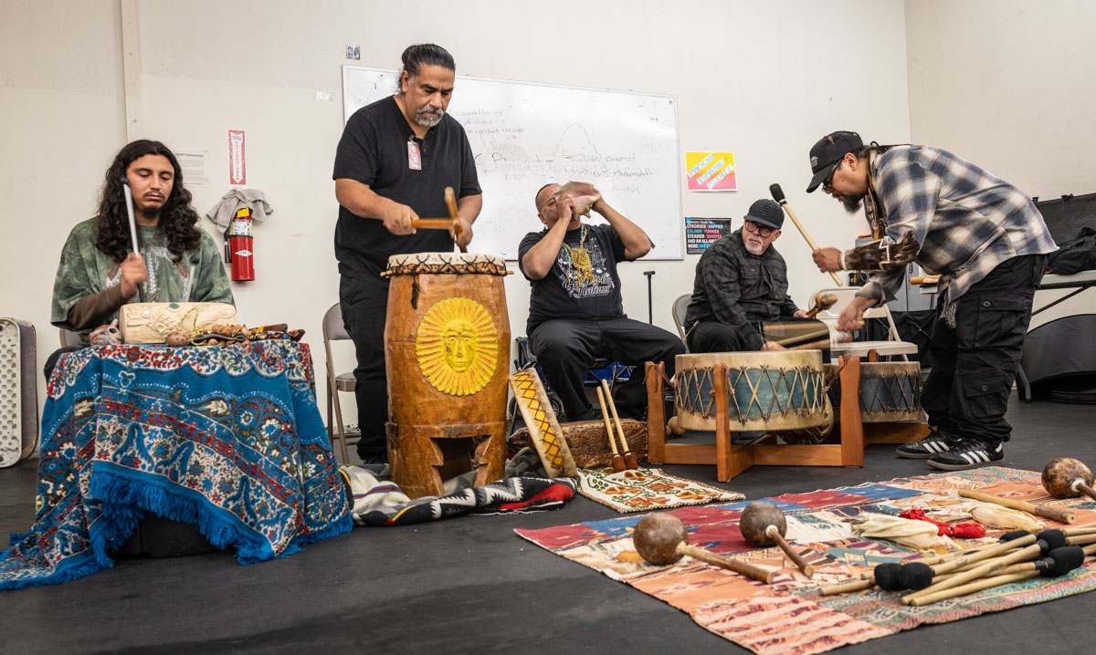 Yaotl Orozco and Zacarias Bernal are the teaching artists for Tia Chucha’s Cultural Music class. Yaotl is also part of the band of Aztlan Unearthed. The teaching artists were joined by Aztlan Unearthed members, Frank Aragon, Joe Galarza and Ignacio Lopez. This mini concert brought together the band and participants of the class to celebrate through music their accomplishments throughout the class. The class met weekly to share indigenous rhythms, and shared together their healing experiences. Throughout the class they had cultural exchanges, and shared memories and teachings from their home communities.