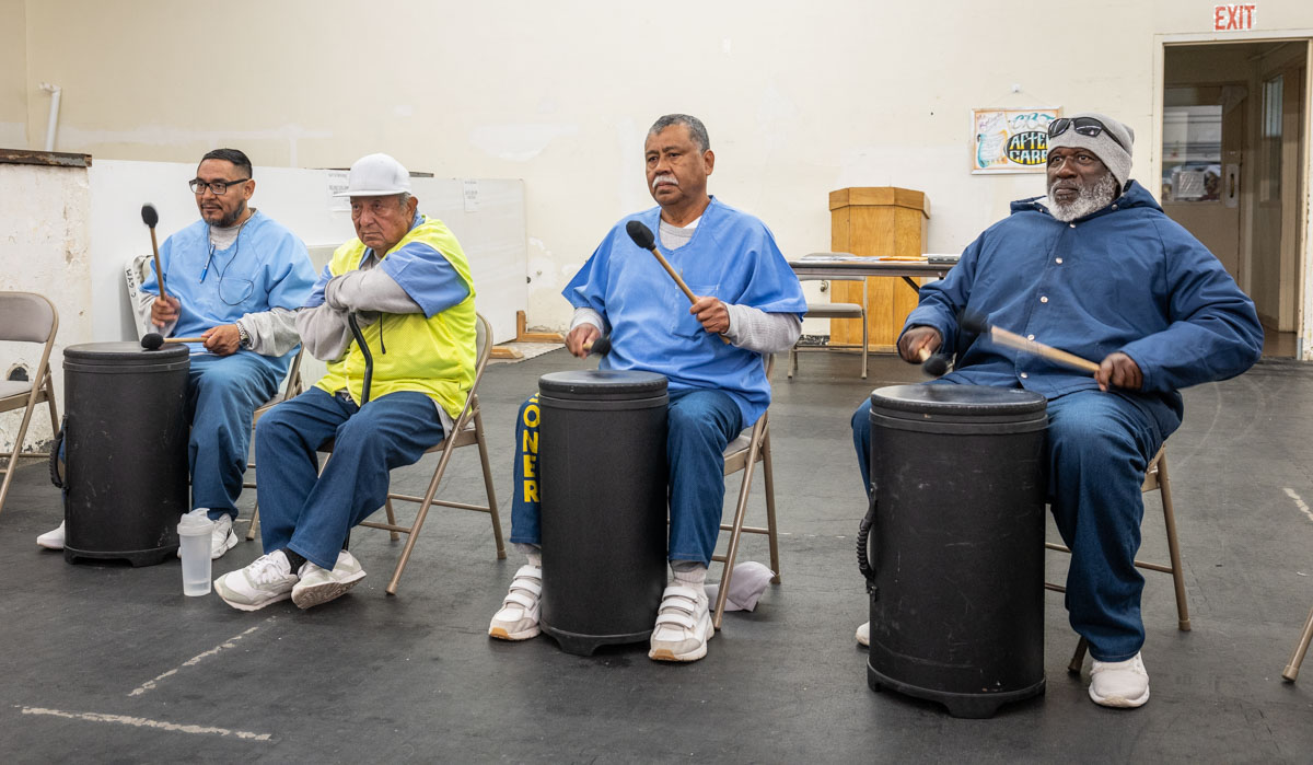 Yaotl Orozco and Zacarias Bernal are the teaching artists for Tia Chucha’s Cultural Music class. Yaotl is also part of the band of Aztlan Unearthed. The teaching artists were joined by Aztlan Unearthed members, Frank Aragon, Joe Galarza and Ignacio Lopez. This mini concert brought together the band and participants of the class to celebrate through music their accomplishments throughout the class. The class met weekly to share indigenous rhythms, and shared together their healing experiences. Throughout the class they had cultural exchanges, and shared memories and teachings from their home communities.
