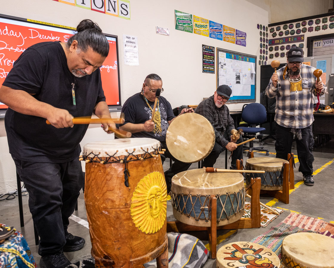 Yaotl Orozco and Zacarias Bernal are the teaching artists for Tia Chucha’s Cultural Music class. Yaotl is also part of the band of Aztlan Unearthed. The teaching artists were joined by Aztlan Unearthed members, Frank Aragon, Joe Galarza and Ignacio Lopez. This mini concert brought together the band and participants of the class to celebrate through music their accomplishments throughout the class. The class met weekly to share indigenous rhythms, and shared together their healing experiences. Throughout the class they had cultural exchanges, and shared memories and teachings from their home communities.