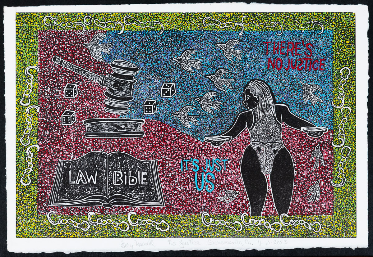 ”No Justice”, Black Linoleum relief cut with Acrylic Paint, 9x12 inches, 2015