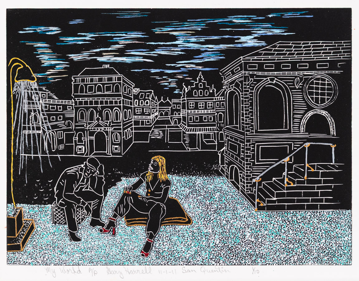 ”My World”, Black Linoleum relief cut with Acrylic Paint, 9x12 inches, 2011