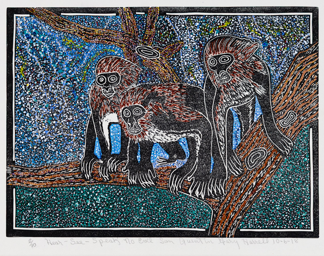 ”Hear–See–Speak”, Black linoleum relief cut, 9x12 inches, 2018