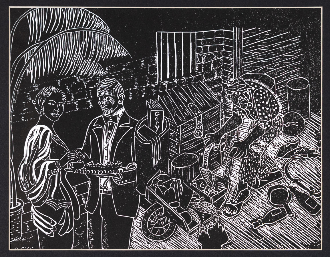 ”Rags to Riches”, Black linoleum relief cut, 16x19 inches, 2010