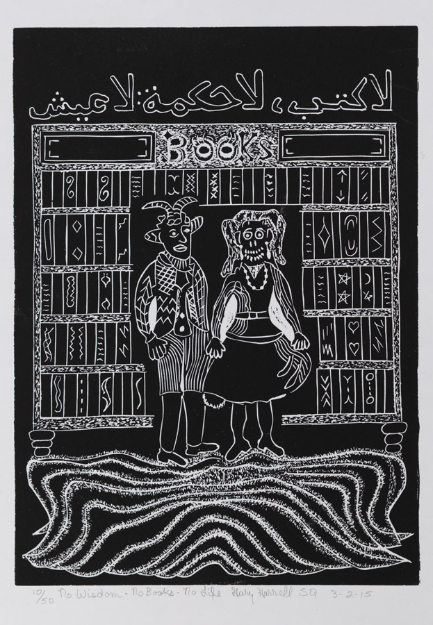 ”No Wisdom–No Books–No Life”, Black linoleum relief cut, 9x12 inches, 2015