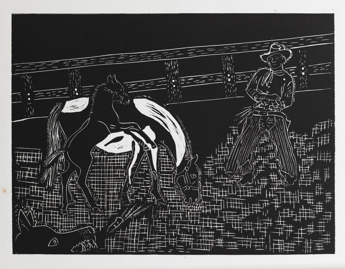 ”Curving the Bullet”, Black linoleum relief cut, 9x12 inches, 2011